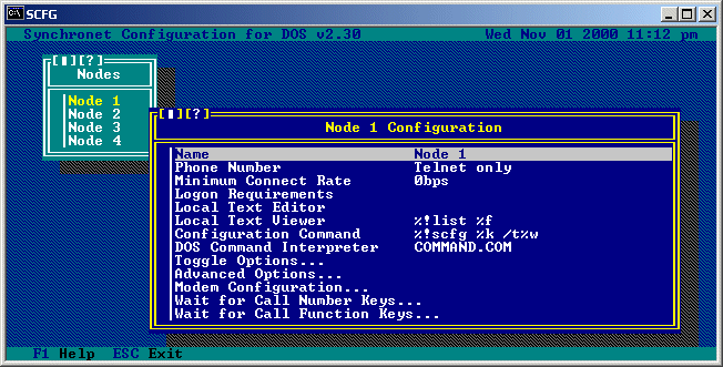 You can configure any node from within SCFG regardless of what computer (or virtual computer) you're using. To configure a node, select "Nodes" from the SCFG "Configure" menu. You will then see a list of all the nodes installed on your system. You will also see the bottom line of the screen now has two additional key commands added, INS (Insert) and DEL (Delete). INS and DEL are used to add and delete nodes from the system. If you select one of the nodes listed, you will receive another menu as follows: