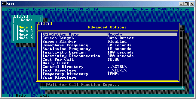 Validation User: This is the number of the user to whom validation feedback is sent. This value will usually be set to 1 (the sysop). If this value is set to 0, then new users will not be required to enter validation feedback. Screen Length (v2 Only): This is the length of the system screen or video window. This should be set to "Auto-Detect" always, unless you have a specific reason to force Synchronet to think the screen length is a certain value. Screen Blanker (v2 Only): When enabled, this will cause the screen for this node to blank out when waiting for a caller after the configured amount of inactive time. Semaphore Frequency (v2 Only): This option specifies how often (in seconds) this node should perform semaphore checks (e.g. checks to see if an event should be run, the node should be downed, etc.). Statistics Frequency (v2 Only): This options specifies how often (in seconds) this node should check system statistics (calls per day, logons today, etc.). Used when updating the WFC statistics display. Inactivity Warning: This is the number of seconds of user inactivity before a warning (typically: "Username, are you still there?") is displayed to the user. Inactivity Disconnection: This is the number of seconds of user inactivity before the user is automatically disconnected. Cost Per Call: This option should only be set to something nonzero for a billing node. A billing node is a node attached to special phone line that will automatically charge the caller a predetermined amount (usually area code 900 or prefix 976 numbers). Set this value to the amount that the caller will be billed after the initial 30 seconds. The user doesn't actually access the BBS through this phone number as 900/976 services charge the sysop by the minute an unrealistic amount. The user just enters his or her name/alias and password and their account is credited with the amount of credits per dollar specified in the System options multiplied by this field (Cost per call) and the user is hung up on. The user then calls the normal BBS nodes and has instant access to their purchased credits. Daily Event: This is the command line to execute when the first caller after midnight logs off. If the program is located in the EXEC directory, this command line should start with the %! specifier. Control Directory: This is the path to the control directory where all the shared configuration (.CNF) files for SBBS are stored. TEXT.DAT (the editable ASCII file that contains almost all of the color and text that SBBS displays) and a few miscellaneous binary data files are also stored in this directory. All nodes of the system must have the same control directory and this directory should not be located on a RAM disk. Text Directory: This is the path to the text directory. This is where all menus, macros, SIF files, QWK files, system information, and other text files are stored. All data beneath this directory branch is READ ONLY as far as Synchronet is concerned, so changing this directory to a RAM drive would enhance performance and wouldn't risk data loss. If you do change this path, be sure to copy all the files and subdirectories of the original text directory there. If you do change this path to a RAM drive, you will need automate the copying of all of the files and subdirectories there upon system startup (possibly AUTOEXEC.BAT) with a sequence of commands like this: md r:\text xcopy c:\sbbs\text\*.* r:\text /S Temporary Directory: This is the path to the directory that this node will use for temporary file storage. This directory must point to somewhere unique and nonvolatile. All the files in this directory are deleted upon execution of the BBS, so do not store any files you want to keep in this directory. Each node must have its own temp directory. For increased performance on batch uploads, it is best if this directory is on the same disk drive as the majority of your file transfer directories.