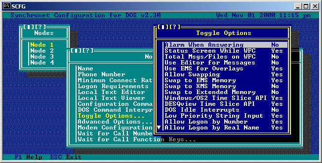 Alarm When Answering (v2 Only): If you would like have the BBS sound an alarm when answering the phone, set this option to Yes. Status Screen While WFC (v2 Only): This node will display a screen with system usage statistics and the current status of all active nodes. Total Msgs/Files While WFC (v2 Only): If you have the system statistics displayed while WFC, and you wish to include the total number of messages and files in the display, set this option to Yes. The retrieval of statistics is faster when set to No. Use Editor for Messages (v2 Only): If this option is set to 'Yes' and you have specified a Local Text Editor, when logged on locally this editor will be used for the creation of all messages. Use EMS for Overlays (v2 for DOS Only): Set this option to 'Yes' to have this node to use EMS memory for overlay files. Setting this option to 'Yes' can help increase the performance of the BBS significantly if enough EMS memory is available (about 360K). Allow Swapping (v2 for DOS Only): Set this option to 'Yes' to allow this node to swap when necessary. If you do not have EMS, XMS, or Extended memory available, and you do not wish to have Synchronet swap to disk, you should set this option to 'No'. Swap to EMS (v2 for DOS Only): When set to 'Yes', Synchronet will attempt to swap to EMS memory when executing a program that is in your "Global Swap List". Swap to XMS (v2 for DOS Only): When set to 'Yes', Synchronet will attempt to swap to XMS memory. Swap to Extended Memory (v2 for DOS Only): When set to 'Yes', Synchronet will attempt to swap to Extended memory. This option should always bet set to 'No' when running under a DOS multitasker. Windows/OS2 Time Slice API (v2 for DOS Only): Set this option to 'Yes' if you are running Synchronet under OS/2. You may experience poor performance if this option is set to 'Yes' and you are running Synchronet under Microsoft Windows v3.x. If this occurs, set this option to 'No'. DESQview Time Slice API (v2 for DOS Only): Set this option to 'Yes' if you are running Synchronet using DESQview. Since Synchronet auto-detects DESQview it will not hurt anything to leave this option set to 'Yes' if you are not running DESQview. DOS Idle Interrupts (v2 for DOS Only): This option defaults to 'Yes'. You should not change this setting. Low Priority String Input: Normally Synchronet does not give up time-slices under multi-taskers when waiting for string input from the user. Setting this option to 'Yes' will for Synchronet to give up time-slices when waiting for string input, this may cause "jerky" keyboard response but will improve overall system performance under multi-taskers. This option should normally be set to 'Yes'. Allow Logon by Number: Setting this option to 'Yes' will allow users to logon by typing their user number at the login logon prompt. Allow Logon by Real Name: When set to 'Yes' this option allows users to enter their real name (or company name) at the login prompt to logon to the BBS. Always Prompt for Password: When set to 'Yes' this option will cause the user to ALWAYS be prompted for a password at logon, even if they have entered an incorrect (non- existent) name at the login prompt. Disable Local Inactivity (v2 Only): If you wish to disable the user inactivity warning and auto-logoff for local logons, set this option to 'Yes'. Disable Local Keyboard (v2 Only): If this option is set to 'Yes', the local keyboard will be completely disabled when Synchronet is run. The only way to exit Synchronet would be to down the node from another process or reboot the machine. Local System Protection (v2 Only): If you wish to require the system password for WFC commands and local sysop Alt-key combinations, set this option to 'Yes'. Beep Locally (v2 Only): To disable the local speaker of this node for online beeps, set this option to 'No'. Allow 8-bit Remote Logons: To allow E-7-1 terminals to use this node, set this option to 'No'. This will also eliminate the ability of 8-bit remote users to send IBM extended ASCII characters during the logon sequence. Reset Video Between Calls (v2 Only): If this option is set to 'Yes', Synchronet will reset the current node console's video mode before each WFC cycle. This option should be set to 'No' for most configurations.