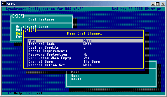 Name: This is the name of this chat channel, and what will be displayed to users when viewing a list of available chat channels. Internal Code: This is an internal code for SBBS to distinguish this chat channel from the others on the system. This must be a unique name of up to 8 valid DOS filename characters. Cost in Credits: This is the amount of credits which will be deducted from the users account when joining this particular chat channel. Access Requirements: A user must meet the criteria set here in order to be able to use (or even see) this chat channel. Password Protection: If you wish to allow users to be able to lock this channel with a password (only users knowing this password can enter the channel), you should set this option to Yes. Guru Joins When Empty: Set this option to Yes to have the selected chat guru enter this chat channel when there is only one user in the channel. Channel Guru: This is the guru which will join this channel (if the above option is set to yes). Selecting this option will give you a list of available chat gurus to choose from. Channel Action Set: This is the chat action set which will be available to users in this channel. Selecting this option will give you a list of available chat action sets.