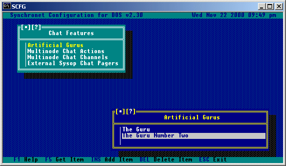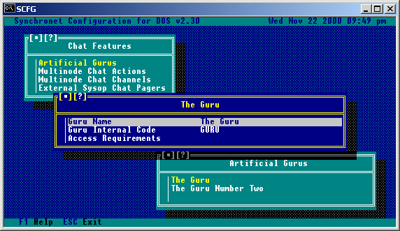 Guru Name: The name users will see when chatting with this artificial guru. Guru Internal Code: This is an 8 character code used internally by Synchronet and should be unique for each guru. This is also the filename which will be used for the intelligence engine for this guru (with the .DAT extension, located in your CTRL directory). See the section on customization for information on customizing chat gurus. Access Requirements: Only users meeting the criteria set here will be able to chat with this guru.