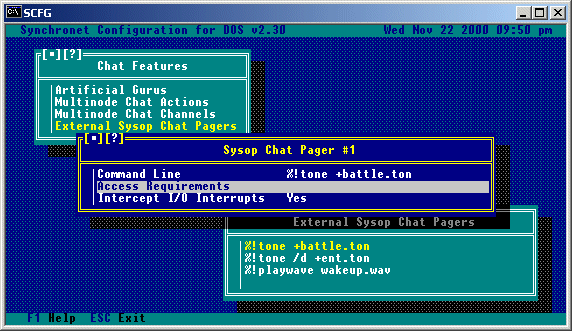 Command Line: This is the command line necessary to invoke the chat pager. Access Requirements: This is the list of criteria a user must meet for this pager to affect them. Intercept I/O Interrupts: If the chat pager specified produces screen output that the user should see (or a series of beeps that the user should hear), this option should be toggled to Yes.