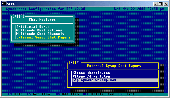 This option allows for sysops to have custom chat pages (external to what is available in Synchronet). Sysops can have .TON files played when certain or all users page, or if a sound card is installed, the sysop may have a .WAV or .VOC file play. Selecting this option will give you a list of currently configured chat pagers.