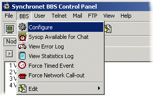 The last window that opens will start the Synchronet Configuration Program (SCFG). To run SCFG again later you can load it from the Synchronet Control Panel (SBBSCTRL) by selecting BBS and then Configure from the menu bar.