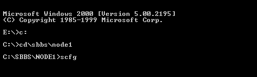 SCFG is the Synchronet Configuration Utility which can be executed from the "Waiting for call" screen by hitting 'C', or from DOS by typing SCFG from any node directory. Example: