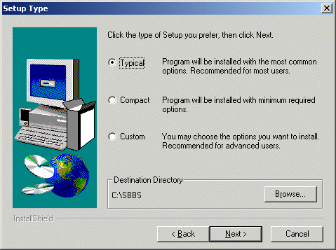 The default installation directory is recommended for most users. If you choose to change the installation directory, it is critical that you DO NOT use a path with long filenames or spaces as Synchronet still relies on some 16-bit DOS utilities which require DOS-compatible 8.3 file and directory names to function. It is recommended you use a directory named SBBS off of the root directory on one of your hard drives (e.g. C:\SBBS).