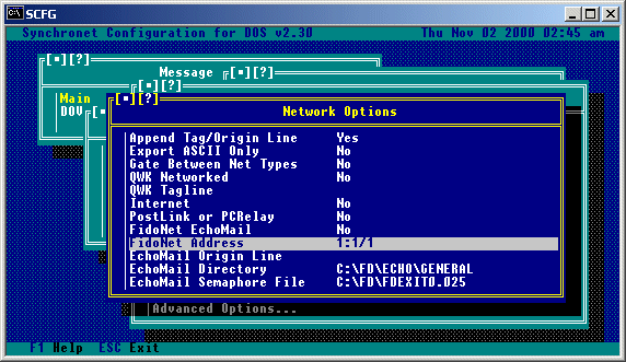 Append Tag/Origin Line: If you want a tagline (QWK network) or origin line (FidoNet) to be appended to messages sent out on the network from this sub-board, set this option to Yes. Export ASCII Only: Set this option to Yes if this sub-board should only be exporting ASCII characters to message networks. Gate Between Net Types: If this sub-board is simultaneously networked with multiple networks using different network technologies, and you want messages imported from one network to be exported to the other network(s), you must set this option to 'Yes'. Gating messages between networks usually requires specific authorization from the moderator of each network. Do not set this option to 'Yes' unless you are absolutely sure you understand the consequences. QWK Networked: Setting this option to Yes will limit posted message titles to the QWK packet limitation of 25 characters and allow QWK network accounts to upload and download messages to/from this sub-board. QWK Tagline: This is an optional tagline that will be used for this sub-board. If this field is blank, the default tagline will be used. If "Append Tag/Origin Line" is set to No, then no tagline will be used. Internet: If this sub-board is networked via the internet, this toggle option should be set to 'Yes'. PostLink or PCRelay: If this sub-board is networked via PostLink or PCRelay, set this option to Yes. FidoNet EchoMail: If this sub-board is networked via FidoNet, set this option to Yes. FidoNet Address: This is the FidoNet address used for this sub-board. EchoMail Origin Line: This is an optional origin line that will be used for this sub-board. Do not include the FidoNet address in this line. Synchronet automatically adds the " * Origin: " and "(Zone:Net/Node.Point)". If this field is blank, the default origin line will be used. If "Append Tag/Origin Line" is set to No, then no origin line will be used. EchoMail Directory: This is the storage directory where FidoNet style (FTS-0001 stored message format) messages are imported from and exported to for this sub-board (using SBBSFIDO a defunct method of importing/exporting FidoNet echomail). If this option is blank, then the EchoMail base directory is used with the internal code of this sub-board as the sub-directory where the FidoNet messages are stored. EchoMail Semaphore File: This is the path and filename of a file that should be created to trigger your front-end mailer to export FidoNet EchoMail.