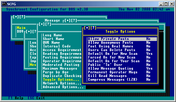 Allow Private Posts: If you want to allow users to post private messages to another user on the sub-board, set this option to Yes. Since Synchronet has an internal e-mail system, this option is usually only set to Yes on networked sub-boards that allow private posts. You can also force private posts on this sub-board by setting this option to Only. Allow Anonymous Posts: If you want to allow users that have the 'A' exemption to be able to post anonymously on this sub-board, set this option to Yes. You may also force anonymous posts by any one (with or without the 'A' exemption) by setting this option to Only. Post Using Real Names: If you wish posts on this sub-board to be posted using the real name of a user instead of his/her alias, set this option to Yes. Many networks require BBSs that allow aliases to force real names on networked sub-boards. Users Can Delete Posts: You may allow users to delete their posted messages by setting this value to Yes. You may allows users to delete their messages only if it is the last message on the sub-board by setting this value to Last. Default On for New Scan: If this option is set to Yes, this sub-board will default to 'On' when a user does a new message scan on this sub-board for the first time. Forced New Scan: If this option is set to Yes, the sub-board will not be skipped in new message scans even if the user has configured his or her new scan to not contain this sub-board. Default On for Your Scan: If this option is set to Yes, this sub-board will default to 'On' when a user does a new message scan for personal messages on this sub-board for the first time. Public 'To' User: If you wish all posts to be prompted for a 'To' user, set this option to Yes. Many networks do not allow private messages on networked sub-boards, so the only way to send a message 'To' someone is to send it publicly with a 'To' field. Normally, 'To' users are only prompted for on private posts. Allow Message Quoting: If you wish for users to be able to quote from other messages on this sub-board, set this option to Yes. Permanent Operator Msgs: Setting this option to Yes will cause messages posted by the Sysop (or sub-op) to be marked as permanent (will not be deleted by normal maintenance). Kill Read Messages: If you wish for messages to be deleted after the recipient has read the message, set this option to Yes. To delete only those messages marked as private after they've been read, set this option to Private. Compress Messages (LZH): When this option is set to 'Yes', the BBS will utilize the LZH compression method when storing messages. This will cause message importing to be slower, but can conserve disk space (30% to 50%) which can mean tens or even hundreds of megabytes of extra space on BBSs with large message bases.