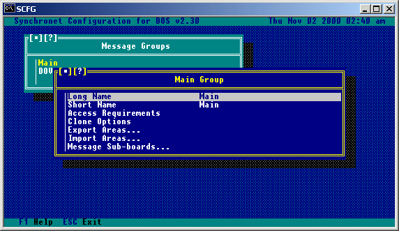 Run SCFG and select "Message Base" from the SCFG main menu and add any additional message groups you want. A message group is a group of message sub-boards that have a similar subject matter or other common element. It is common to put all of your local sub-boards in one group and your networked sub-boards (where messages are shared with other BBSs) into other groups. An example configuration that separates local and networked sub-boards into groups: Group Sub-boards ~~~~~~~~~~~~~~~~~~~~~~~~~~~~~~~~~~ Local General Local Sports Local Debate Local Literature Local Technology Local Advertisements DOVE-Net General DOVE-Net Advertisements DOVE-Net Entertainment DOVE-Net Debate DOVE-Net Hardware/Software DOVE-Net Programming DOVE-Net Synchronet DOVE-Net Synchronet Sysops FidoNet Interuser Discussion FidoNet Politics FidoNet Unix FidoNet OS/2 FidoNet DESQview Another use of message groups is to group sub-boards of similar topic together: Group Sub-board ~~~~~~~~~~~~~~~~~~~~~~~~~~~~~~~~~ Main Sysop Messages Main General Main Debate Main Entertainment Main BBS Ads and ANSI Technical Software Help Technical Hardware Help Technical Programming Adult General Adult Singles Only Adult Dear Abby Adult Jokes Adult Financial And you certainly can mix the two examples of message group utilization given above or invent your own. Or, you can just have one message group for all of your sub-boards - forgoing the organizational advantages of using multiple groups. To add message groups, select the position you want the new message group to be in with the arrow keys. If you want the new message group to be the first group, highlight the top line. If you want the message group to be added to the end of the group list, highlight the bottom line. Hit INS (insert key) to add a new message group, or DEL (delete key) to remove an existing one. Following is a list of options available when creating or modifying a message group.