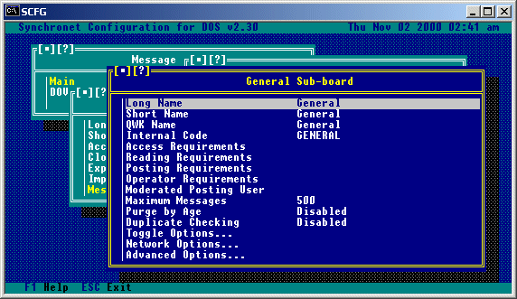 Long Name: This is a description of the sub-board which is displayed in sub-board listings. Short Name: This is a description of the sub-board which is used for prompts. QWK Name: This is the name of the sub-board used for QWK off-line readers. Internal Code: This is an internal code for SBBS to distinguish this sub-board from the others on the system. This should be a unique name of up to 8 valid DOS filename characters. Access Requirements: These are the requirements that a user must meet to be able to access this sub-board. Reading Requirements: Use this option to set the security requirements to read messages on this sub-board. Posting Requirements: Use this option to set the security requirements to post on this sub-board. Operator Requirements: Use this option to set the security requirement to be a sub-op on this sub-board (note: sub-op is a sysop of a sub-board). Moderated Posting User: Users meeting the criteria set here will have their posts "moderated" when posting on this sub-board. Moderated messages cannot be read by users or exported until validated by a sub-op or sysop. Maximum Number of Messages: This is the maximum number of messages that will be allowed on the sub-board. This number is used by SMBUTIL to maintain the message base and remove the oldest messages when this limit is exceeded. Purge by Age: This is the maximum length of time (in days) that old messages will be kept in a sub-board. Duplicate Checking: Use this option for duplicate message checking (comparing a new message against those previously imported to detect a duplicate message created by program or user error). Enabling duplicate message checking requires you specify a maximum number of CRCs. This is the number of previously imported messages to keep track of (using CRC calculation). This number, if used, should be set to about one weeks worth of messages. Large numbers in this field will slow down message importing.