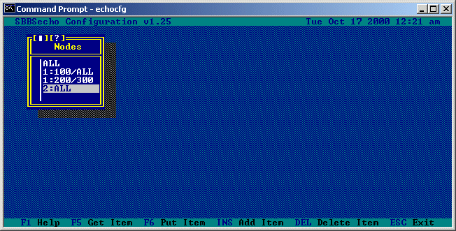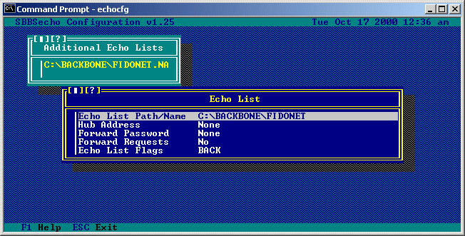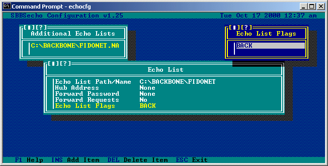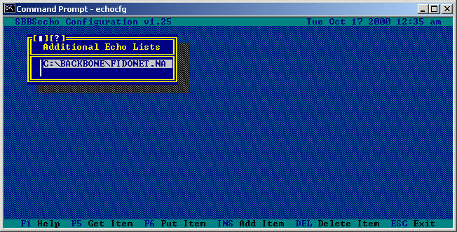Pressing the INSert key will allow you to add a new echo list, pressing the DELete key will remove the currently highlighted echo list, and pressing ENTER on the currently highlighted echo list will allow you to edit information about that list: