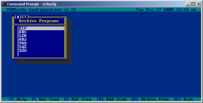 Allow Nodes to Add Areas in the AREAS.BBS List: When set to 'Yes', SBBSecho will allow nodes to add areas (via area manager) which are listed in the AREAS.BBS list. When set to 'No', SBBSecho will only allow nodes to add areas from any additionally configured echo lists which they have access to. Archive Programs... This option allows you to add or remove archive programs from SBBSecho. Selecting this option will bring you to the following menu: