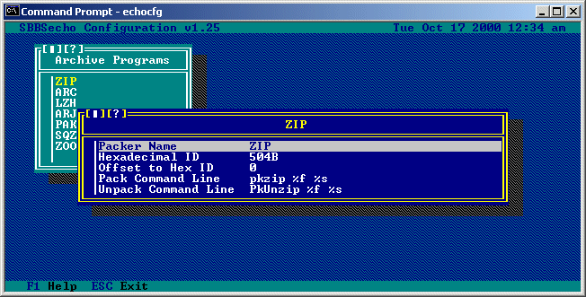 At the Archive Programs... sub-menu, pressing the INSert key will allow you to add a new archive program. Pressing the DELete key will remove the currently highlighted archive program. And pressing ENTER on the currently highlighted archive program will allow you to edit the options for that particular program from a menu like the following (note that the name of the archive program you are editing appears at the top of the window):