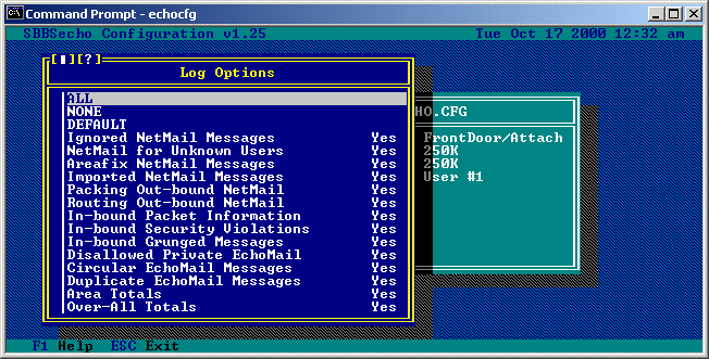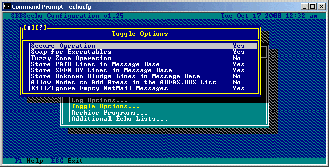Selecting ALL, NONE, or DEFAULT will toggle all of the options to 'Yes', 'No', or to their default states, respectively. Toggle Options... These options allow you to toggle various features in SBBSecho. Selecting this option will bring you to the following sub-menu: