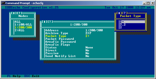 Packet Type: This is the packet type that will be used when creating mail packets for this node. The default packet type used by SBBSecho is 2+. If you are a "point" address (e.g. 1:100/100.1) you should use either a type 2+ or 2.2 packet since type 2 packets do not support point numbers. Selecting this option will allow you to choose from a menu of currently supported packet types:
