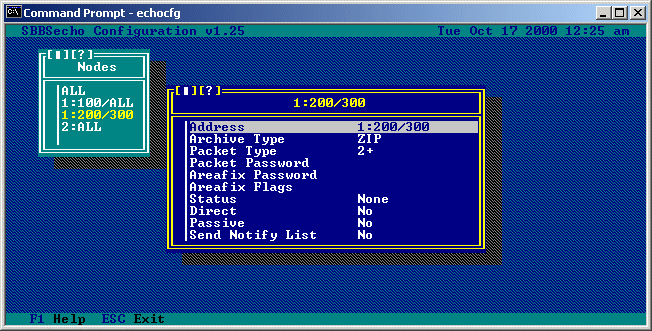 Address: This is the address of the node you are editing, selecting it will allow you to change this to a different address. Using the "ALL" wildcard in place of one of the address components will allow you to configure settings for all nodes that meet that specification (e.g. all nodes in zone 1 can be specified as 1:ALL or all nodes in zone 1, net 103 can be specified as 1:103/ALL).
