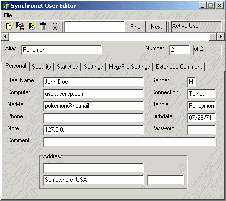 Below is a screenshot of the GUI User Editor with a sample user and data shown. How this screen looks will vary depending upon your configuration and what data you decide to collect from new users. There are many options and settings available in the User Editor and you should spend some time getting familiar with this feature.